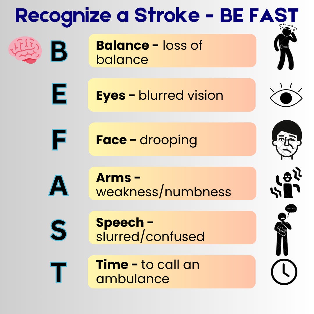 Here is an easy to understand and quick to recall mnemonic to recognize and respond to the signs of stroke - BE FAST.